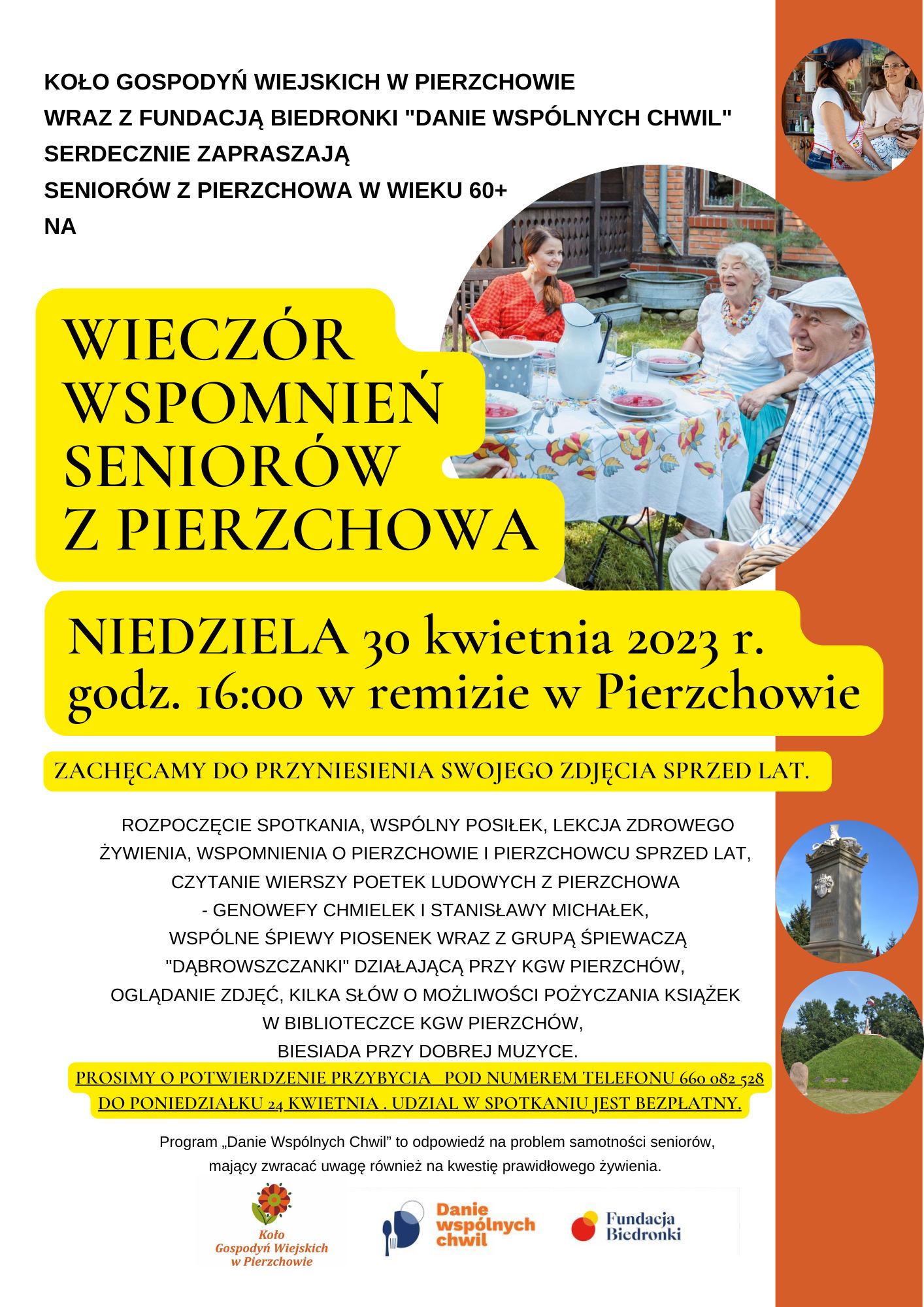 W I edycji programu „Danie Wspólnych Chwil” bierze udział 750 Kół Gospodyń Wiejskich. Jednym z uczestników programu jest nasze KGW Pierzchów, które będzie organizować cykliczne spotkania dla seniorów przy wspólnym posiłku, integrując ich i zachęcając do wyjścia z domu. Na spotkania mogą przyjść seniorzy, którzy czują się samotni, chcieliby bliżej poznać sąsiadów lub po prostu spędzić czas w towarzystwie rówieśników.